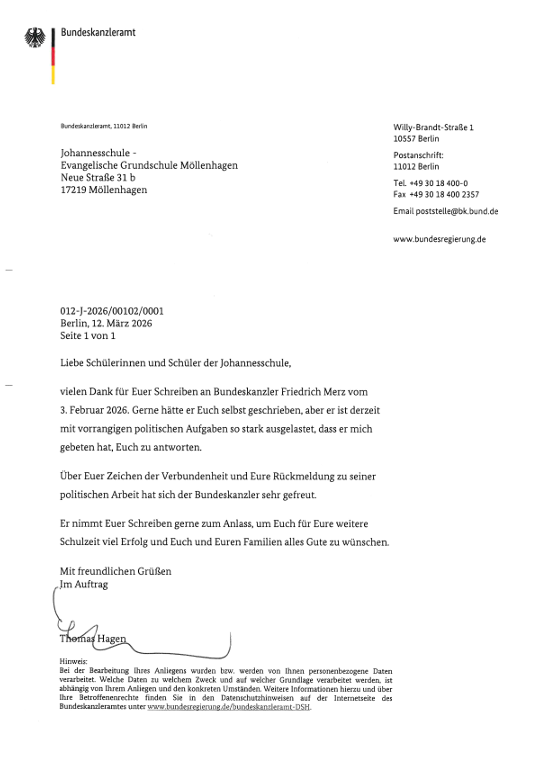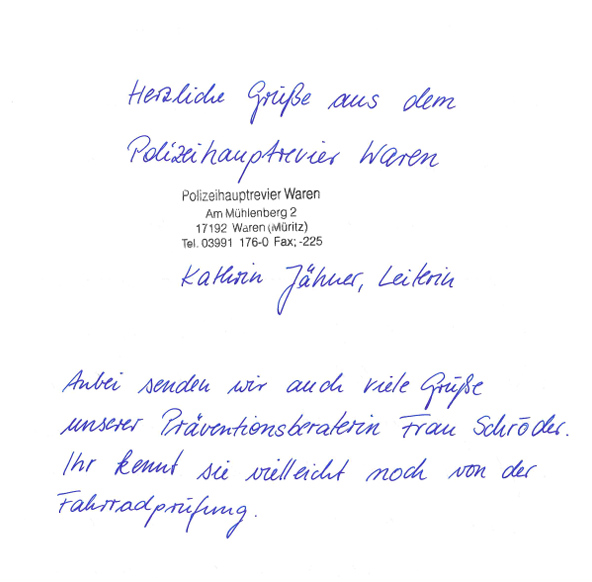 Auch wenn der Bundeskanzler leider keine Zeit hatte, persönlich zu antworten, erhielten wir dennoch Post aus dem Bundeskanzleramt – eine große Freude für die Kinder! Besonders aufregend war der Besuch der Polizei: Sie kam persönlich vorbei, brachte ein Geschenk mit und überreichte einen persönlichen Brief von der Leiterin des Reviers in Waren. Auch die Feuerwehr meldete sich persönlich zurück.